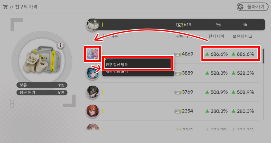 가장 상단에 있는게 가장 비싸게 팔 수 있는 친구집임