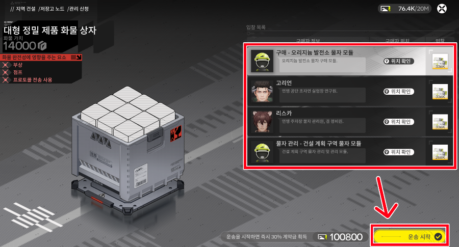 위치와 입찰가를 확인하고 운송시작