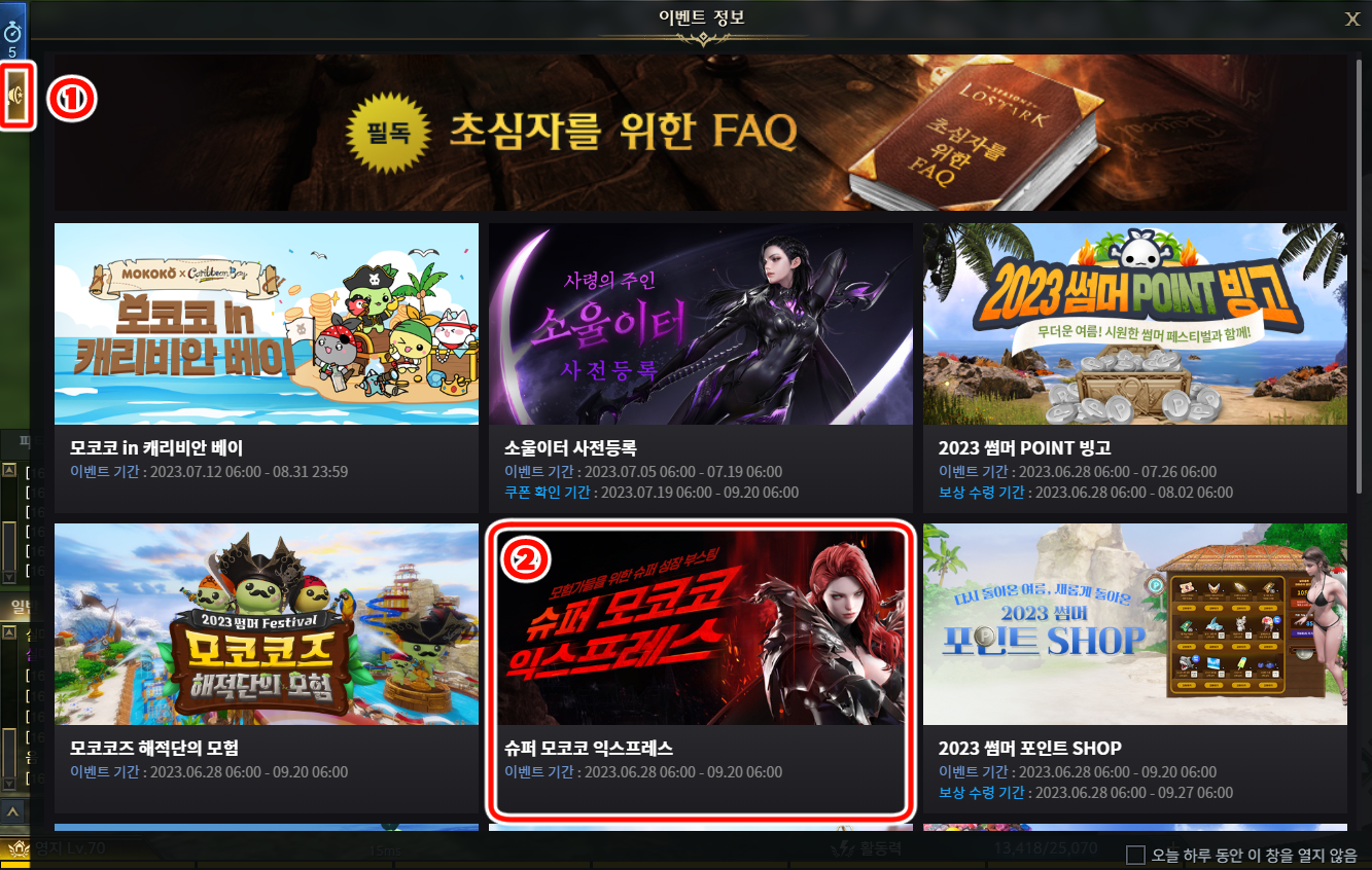 2023.06.28.(수) 업데이트로 2023 슈퍼 모코코 익스프레스와 점핑권 이벤트 시작 ! 이번 로아온 썸머는 이래저래 말이 많았지만 그래도 편의성 면에서는 많이 신경쓰려했다고 생각해요 저는 선발대