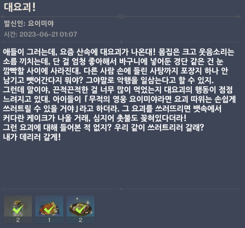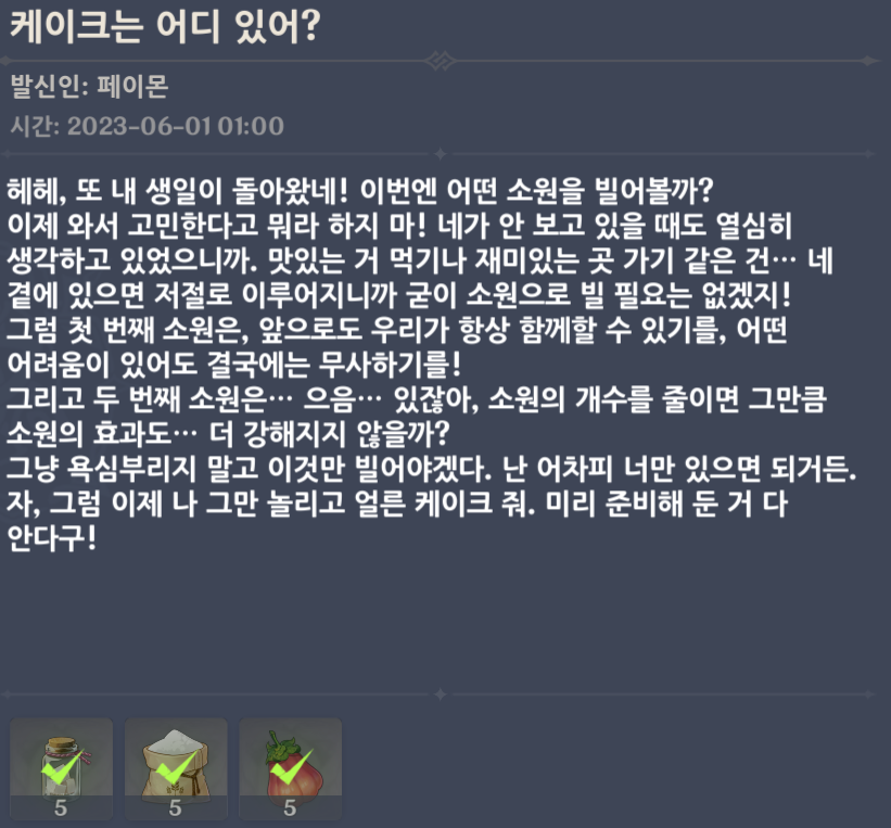 랄라라♪ 라~♪ 라~♪ 히힛, 페이몬 노래 잘하지? 생일을 축하해 주러 꿈속까지 와줘서 고마워, 나 정말 기뻐! 꼬르륵——앗, 꿈속에서도 배가 고픈 거였나? 그럼 계속 자면 안 되겠네. 빨리 일어나지 않으면 여행자가 준비한 식사에 늦을 거야! 나중에 봐! 같이 축하하고, 맛있는 거 잔뜩 먹자! 다들 꼭 와야 해!