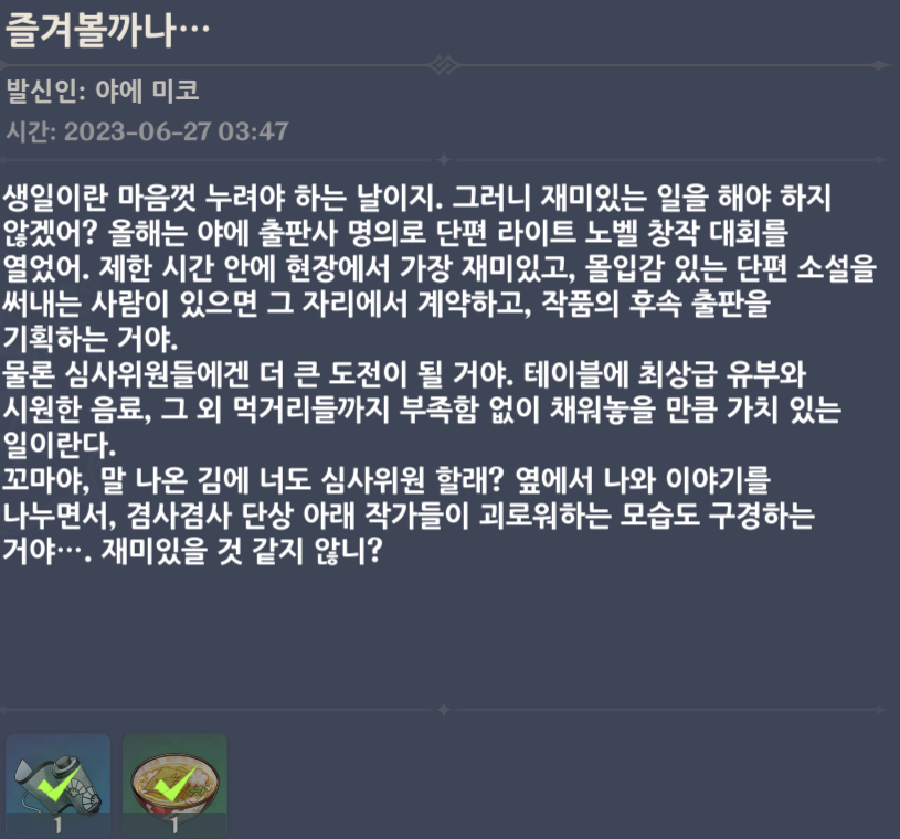 | 2023. 8월 캐릭터 생일 및 편지 모음 [ 원신 ] (1) | 2023.09.01 |