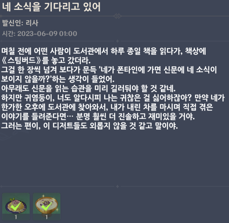 어머~ 책도 제때 반납하고 선물도 가져오다니, 역시 우리 귀염둥이라니까. 축하해, 이번 달 이 누님 마음속 최고의 독자로 등극했어. 이건 내 일을 도와준 귀염둥이에게만 특별히 주는 칭호라구~ 상품이라… 뭐 가지고 싶은 선물 있어? 천천히 생각해 봐, 오늘은 아직 많이 남았으니까.