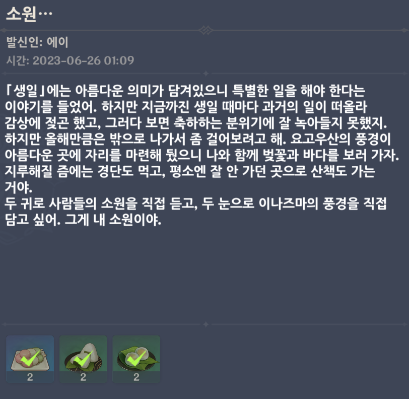 | 2023. 7월 캐릭터 생일 및 편지 모음 [ 원신 ] (0) | 2023.07.31 |