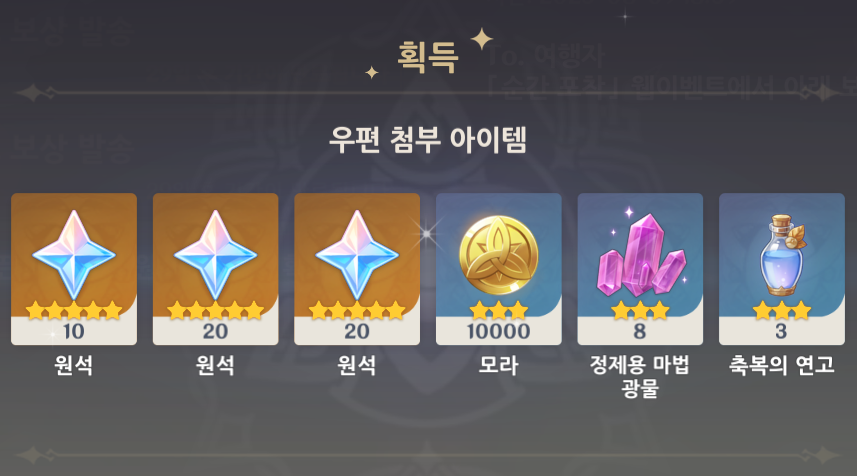 보상 목록 1번 원석x10 모라x10,000 2번 원석x20 축복의 연고x3 3번 원석x20 정제용 마법 광물x8 4번 원석x20 영웅의 경험x4 5번 원석x20 모라x50,000 6번 원석x30 영웅의 경험x5 - 합계 원석 120 모라 60,000 축복의 연고 x 3 영웅의 경험 x 9 정제용 마법 광물 x 8 |