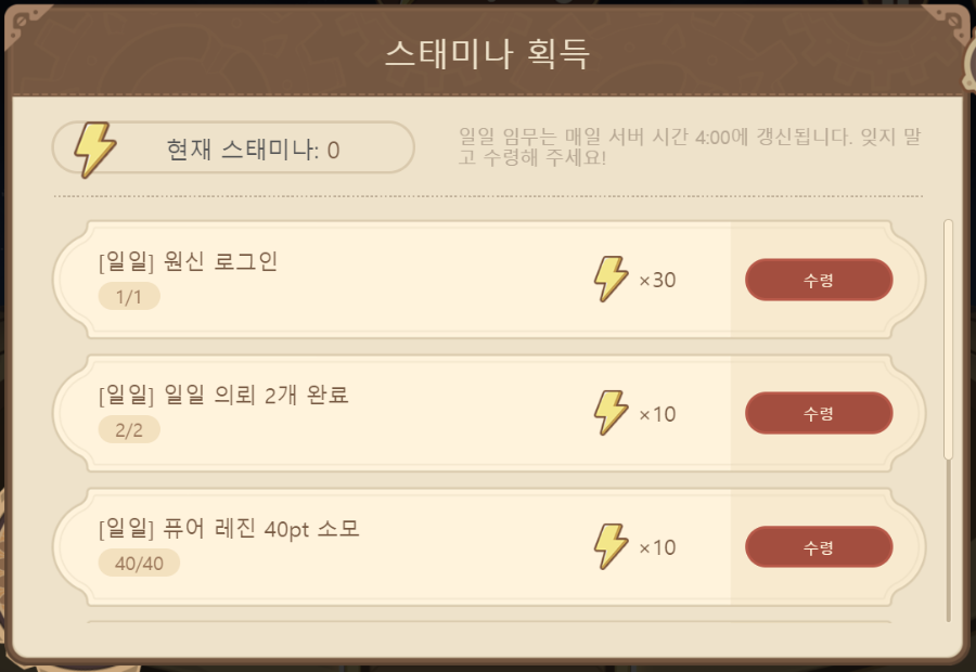 모두 수령해주면 총 100 스테미나를 얻고