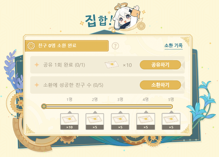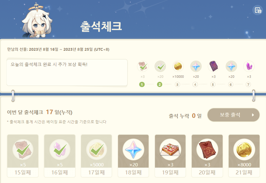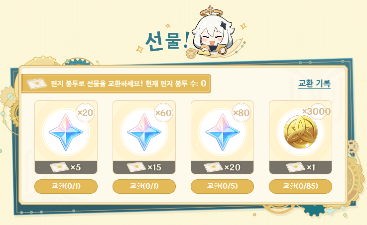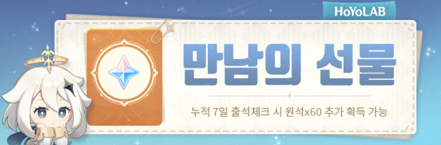 만남의 선물 보상 목록 원석 x 60 영웅의 경험 x 3 모험가의 경험 x 3 모라 x 10,000 정제용 광물 x 3 |