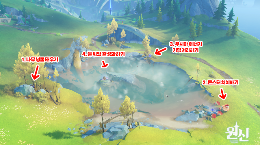 생각보다 쉽게 끝나지 않는 끓는 호수 / 온천 물 식히기 사실 이전 글에선 물 빼기라고 했는데 생각해보니 폰타인은 잠수가 가능해서 물을 뺄 필요가 없단걸 잊었네요 기믹 처리하고 나니 물이