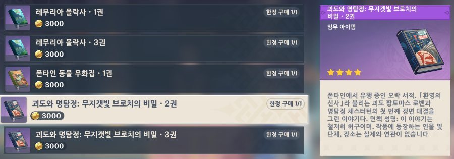 속세 순유 제 4집 업적 교활한 르니르 [ 폰타인 동물 우화집 ] 전집 모으기 폰타인 동물 우화집은 총 3권으로 구성되어있습니다 1권 위치 폰타인성 책 판매 NPC 출판물 판매 노점 주인 휴벨 판매 위