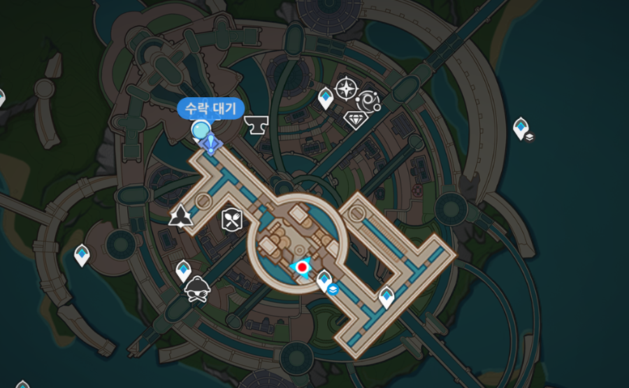 폰타인 성 워프포인트를 열다보면 가운데쯤 지하에 위치한 워프포인트가 있는데 입구를 영 모르겠어서 한참을 헤맸다 일단 워프포인트를 누르면 지하맵을 보여주는데 거기서 원모양으로 되어