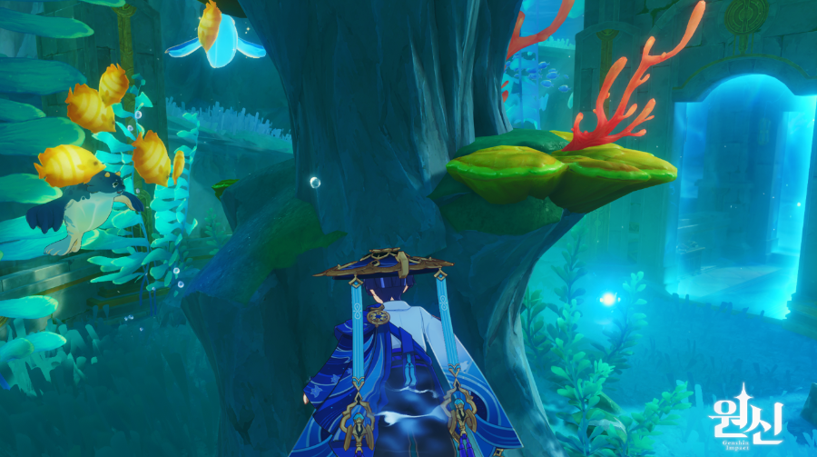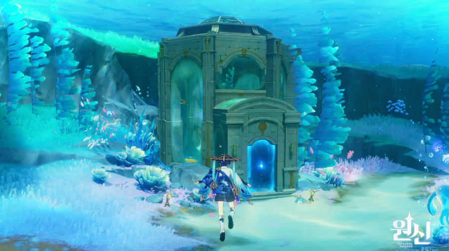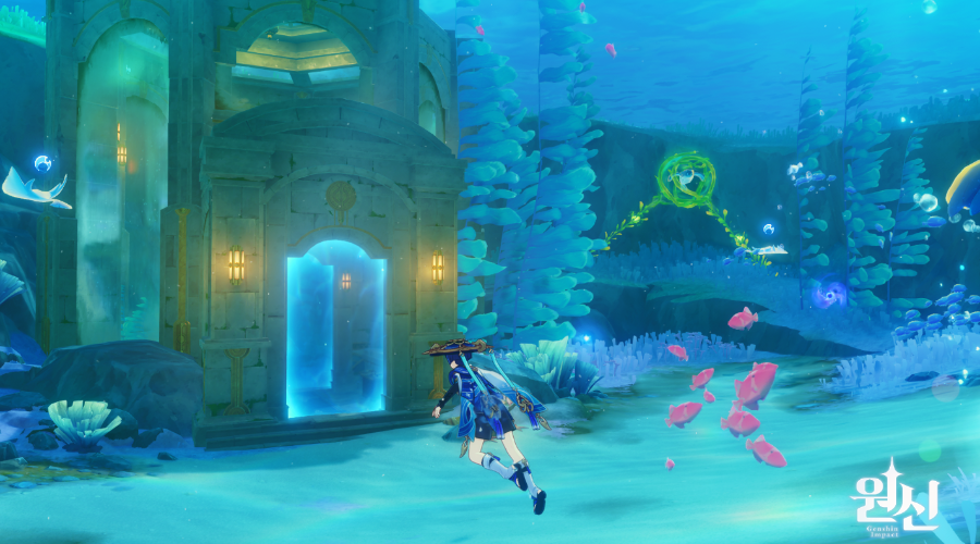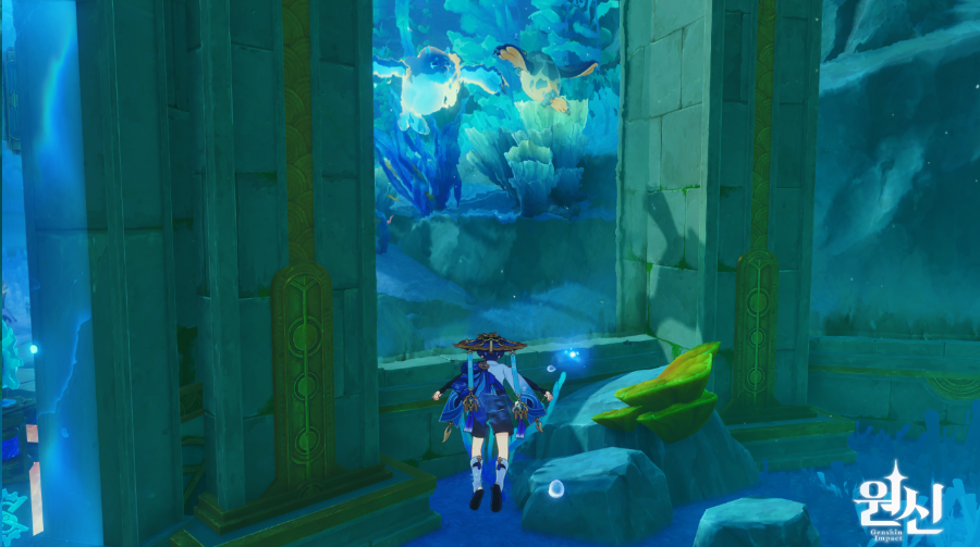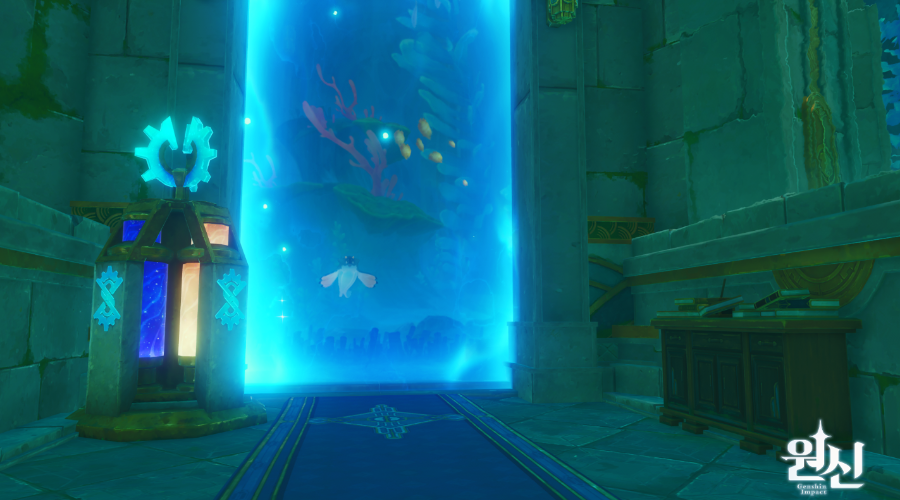 4.0 폰타인 에피클레스 오페라 하우스 뒤쪽 동그랗게 아무것도 없고 막혀있는 해저 지역이 있는데 이곳에 숨겨진 진귀한 보물상자 1개 물의 신의 눈동자 1개는 덤 위치는 여기 루키나 분수 워프
