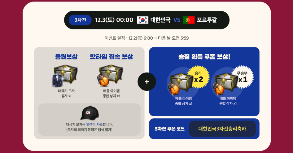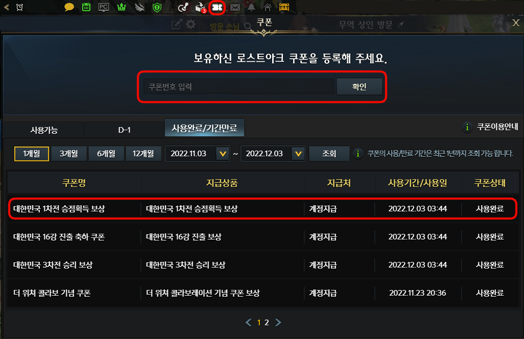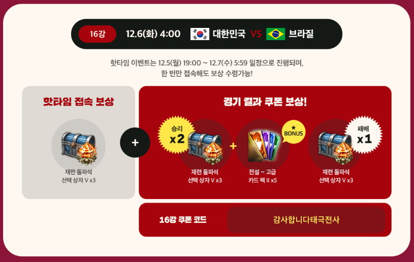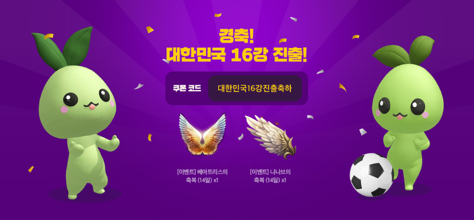 | 함께응원하로아! 16강 쿠폰 | ~ 2022 / 12 / 28 (수) 5:59 | 감사합니다태극전사 |