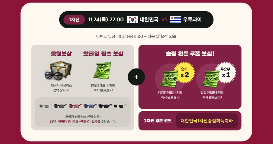 쿠폰코드 - 대한민국1차전승점획득축하