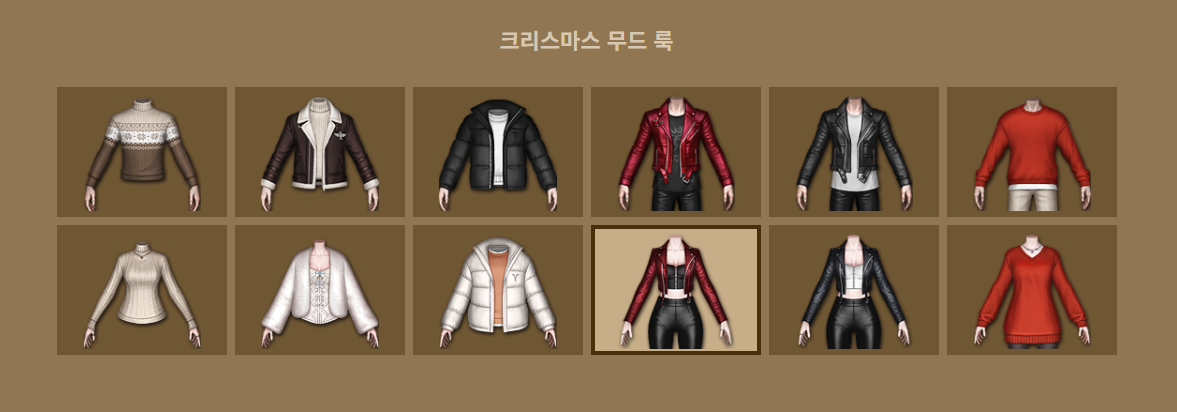 이번에 크리스마스 무드 룩은 모자 1종 / 상의 3종 / 하의 2종 / 상하의 3종으로 구성되어있다.