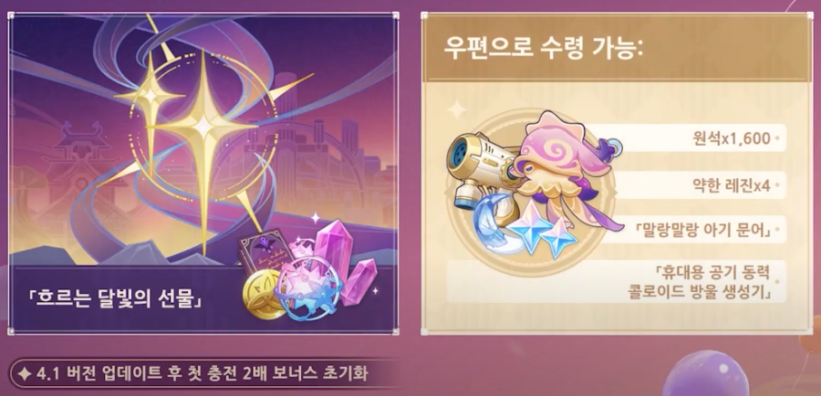 출석 보상 뒤얽힌 인연 x 10 + 기타 아이템 우편 보상 원석 x 1,600 약한 레진 x 4 말랑말랑 아기 문어 휴대용 공기 동력 콜로이트 방울 생성기 |