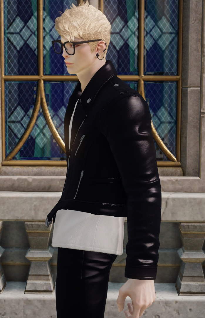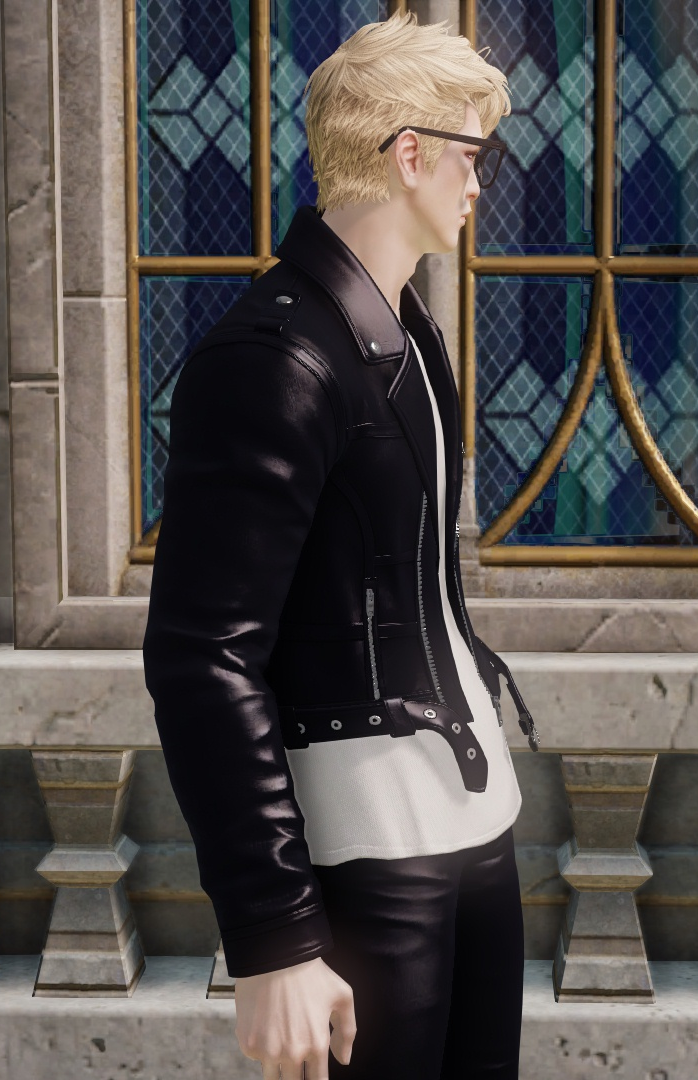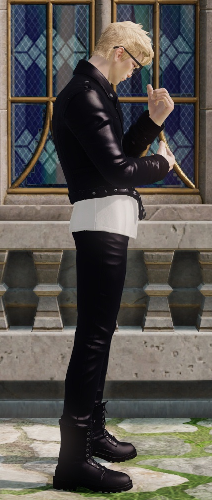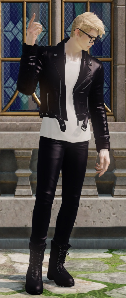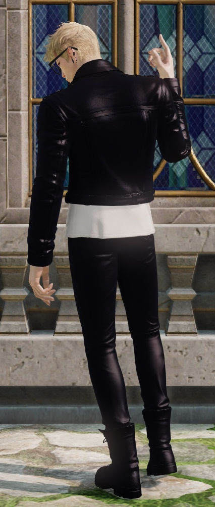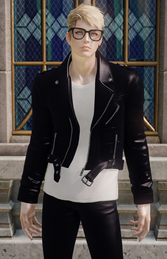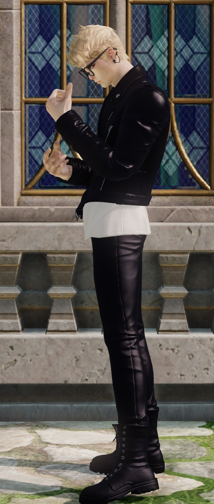 글리터에 있는 등장식은 없음. 티는 천 질감. 자켓과 하의, 신발은 가죽 질감.