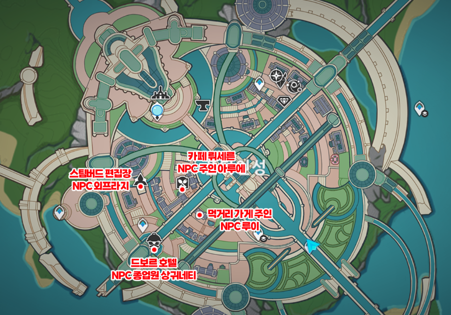 | ★★ | 폰타 | 드보르 호텔 NPC 종업원 상귀네티 카페 뤼세른 NPC 주인 아루에 먹거리 가게 주인 NPC 루이 특별 허가 식당 관리 NPC 울지 |