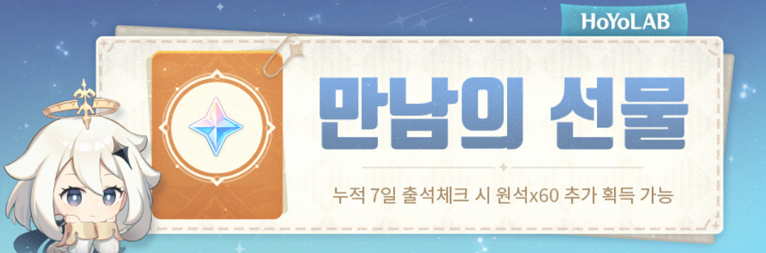 만남의 선물 보상 목록 원석 x 60 영웅의 경험 x 3 모험가의 경험 x 3 모라 x 10,000 정제용 광물 x 3 |