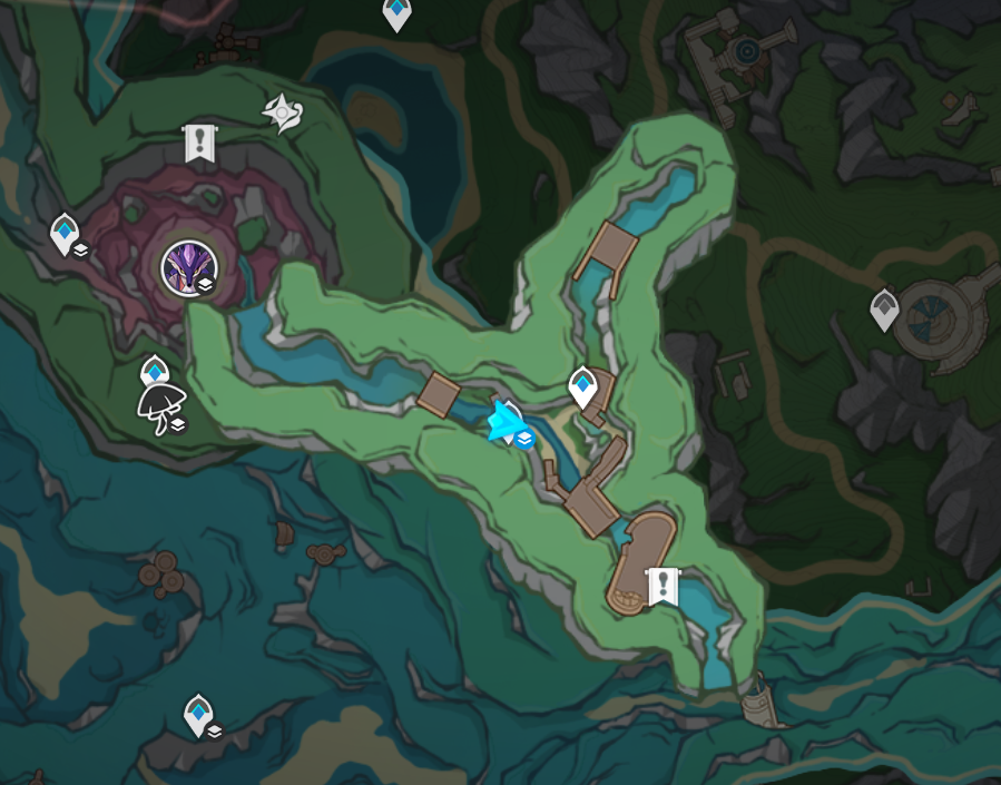 폰타인 지역 특산물 4.1 신규 캐릭터 느비예트 돌파 재료 형광별 파밍 루트 형광별 포인트는 티바트 맵스 기준 총 79개 형광별 분포가 시작하는 리피 구역의 입구부터 위로 올라가는 루트로 적을
