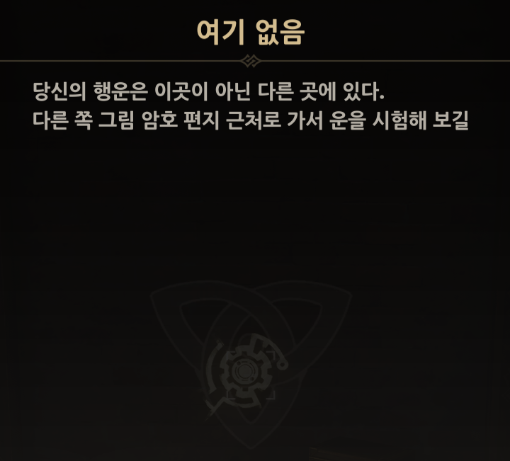 여기 없음 당신의 행운은 이곳이 아닌 다른 곳에 있다. 다른 쪽 그림 암호 편지 근처로 가서 운을 시험해 보길 |