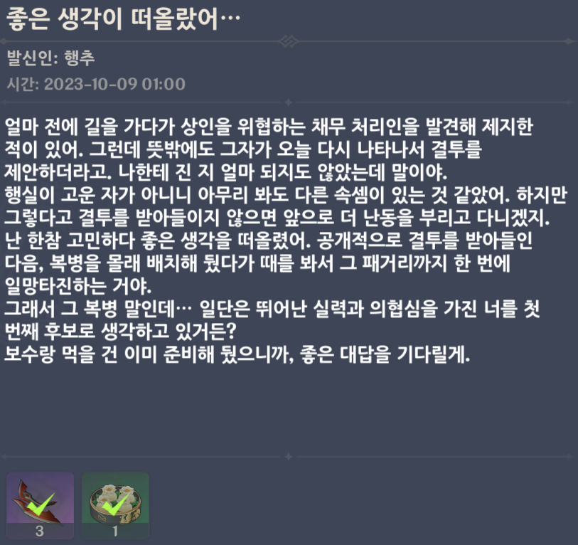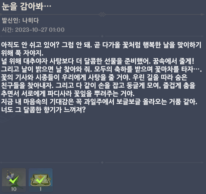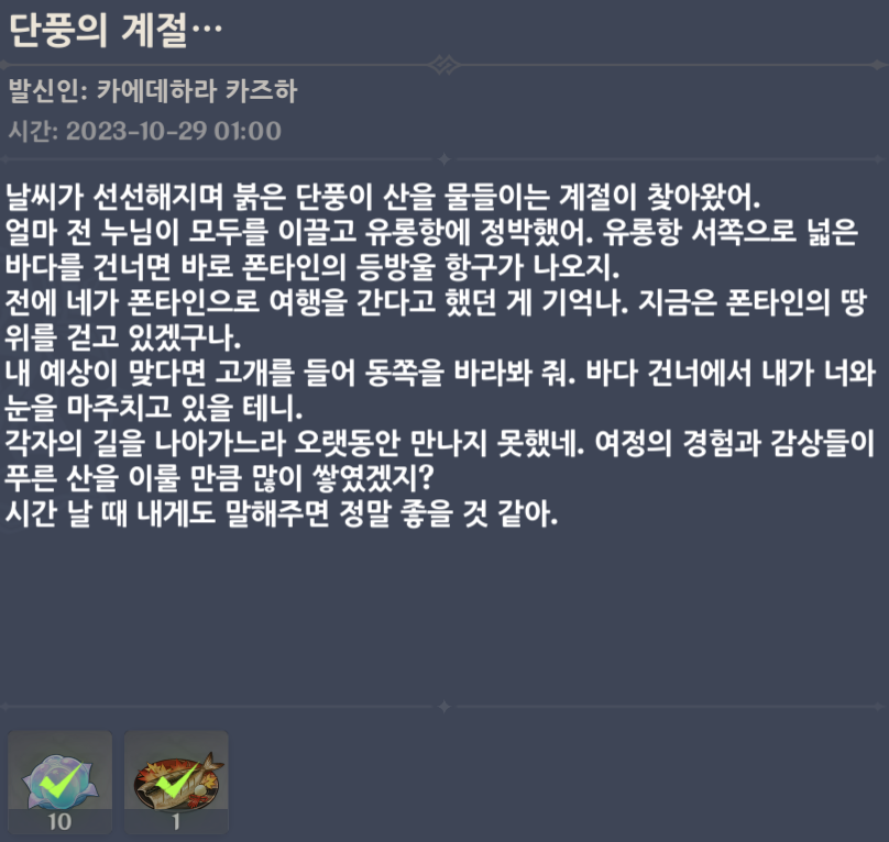 날씨가 선선해지며 붉은 단풍이 산을 물들이는 계절이 찾아왔어. 얼마 전 누님이 모두를 이끌고 유롱항에 정박했어. 유롱항 서쪽으로 넓은 바다를 건너면 바로 폰타인의 등방울 항구가 나오지. 전에 네가 폰타인으로 여행을 간다고 했던 게 기억나. 지금은 폰타인의 땅 위를 걷고 있겠구나. 내 예상이 맞다면 고개를 들어 동쪽을 바라봐 줘. 바다 건너에서 내가 너와 눈을 마주치고 있을 테니. 각자의 길을 나아가느라 오랫동안 만나지 못했네. 여정의 경험과 감상들이 푸른 산을 이룰 만큼 많이 쌓였겠지? 시간 날 때 내게도 말해주면 정말 좋을 것 같아.