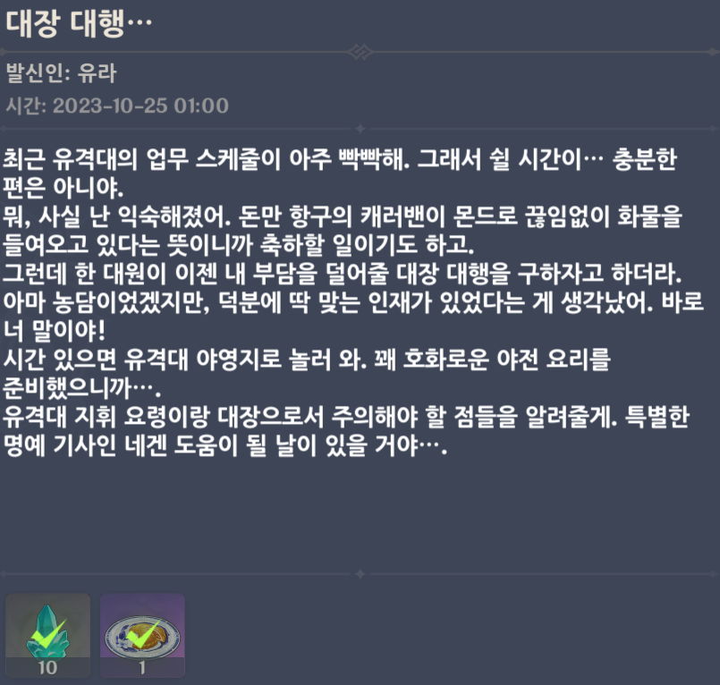 최근 유격대의 업무 스케줄이 아주 빡빡해. 그래서 쉴 시간이··· 충분한 편은 아니야. 뭐, 사실 난 익숙해졌어. 돈만 항구의 캐러밴이 몬드로 끊임없이 화물을 들여오고 있다는 뜻이니까 축하할 일이기도 하고. 그런데 한 대원이 이젠 내 부담을 덜어줄 대장 대행을 구하자고 하더라. 아마 농담이었겠지만, 덕분에 딱 맞는 인재가 있었다는 게 생각났어. 바로 너 말이야! 시간 있으면 유격대 야영지로 놀러 와. 꽤 호화로운 야전 요리를 준비했으니까···. 유격대 지휘 요령이랑 대장으로서 주의해야 할 점들을 알려줄게. 특별한 명예 기사인 네겐 도움이 될 날이 있을 거야···.