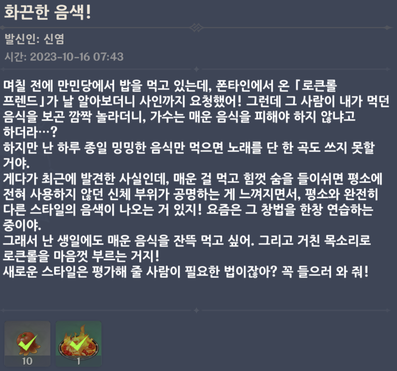 며칠 전에 만민당에서 밥을 먹고 있는데, 폰타인에서 온 「로큰롤 프렌드」가 날 알아보더니 사인까지 요청했어! 그런데 그 사람이 내가 먹던 음식을 보곤 깜짝 놀라더니, 가수는 매운 음식을 피해야 하지 않냐고 하더라···? 하지만 난 하루 종일 밍밍한 음식만 먹으면 노래를 단 한 곡도 쓰지 못할 거야. 게다가 최근에 발견한 사실인데, 매운 걸 먹고 힘껏 숨을 들이쉬면 평소에 전혀 사용하지 않던 신체 부위가 공명하는 게 느껴지면서, 평소와 완전히 다른 스타일의 음색이 나오는 거 있지! 요즘은 그 창법을 한창 연습하는 중이야. 그래서 난 생일에도 매운 음식을 잔뜩 먹고 싶어. 그리고 거친 목소리로 로큰롤을 마음껏 부르는 거지! 새로운 스타일은 평가해 줄 사람이 필요한 법이잖아? 꼭 들으러 와 줘!