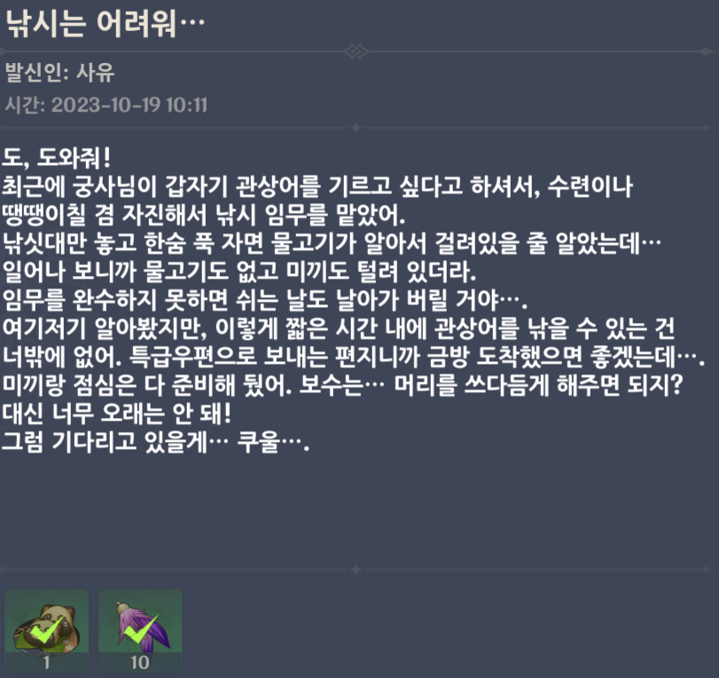 도, 도와줘! 최근에 궁사님이 갑자기 관상어를 기르고 싶다고 하셔서, 수련이나 땡땡이칠 겸 자진해서 낚시 임무를 맡았어. 낚싯대만 놓고 한숨 푹 자면 물고기가 알아서 걸려있을 줄 알았는데··· 일어나 보니까 물고기도 없고 미끼도 털려 있더라. 임무를 완수하지 못하면 쉬는 날도 날아가 버릴 거야···. 여지저기 알아봤지만, 이렇게 짧은 시간 내에 관상어를 낚을 수 있는 건 너밖에 없어. 특급우편으로 보내는 편지니까 금방 도착했으면 좋겠는데···. 미끼랑 점심은 다 준비해 뒀어. 보수는··· 머리를 쓰다듬게 해주면 되지? 대신 너무 오래는 안 돼! 그럼 기다리고 있을게··· 쿠울···.