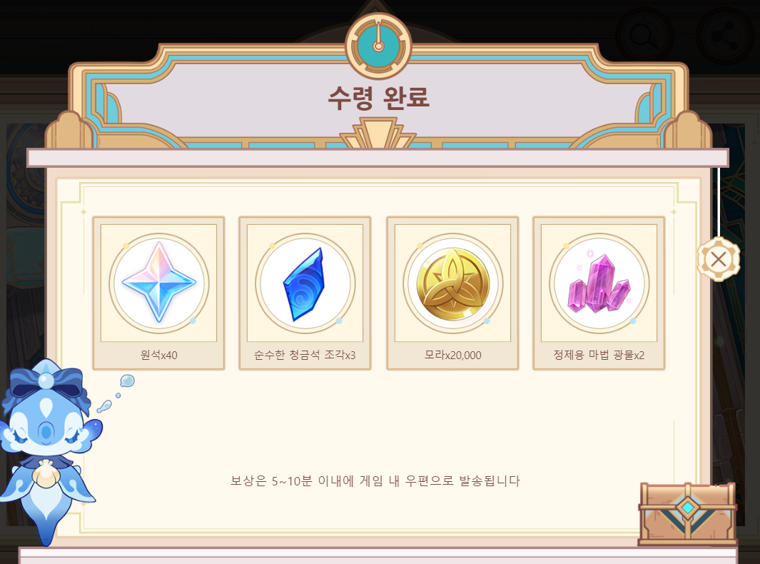 보상 목록 원석 x 40 순수한 청금석 조각 x 3 모라 x 20,000 정제용 마법 광물 x 2 |