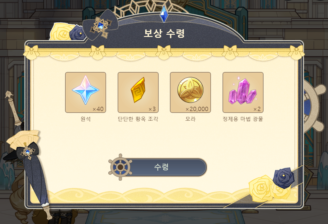 보상 목록 원석 x 40 단단한 황옥 조각 x 3 모라 x 20,000 정제용 마법 광물 x 2 |