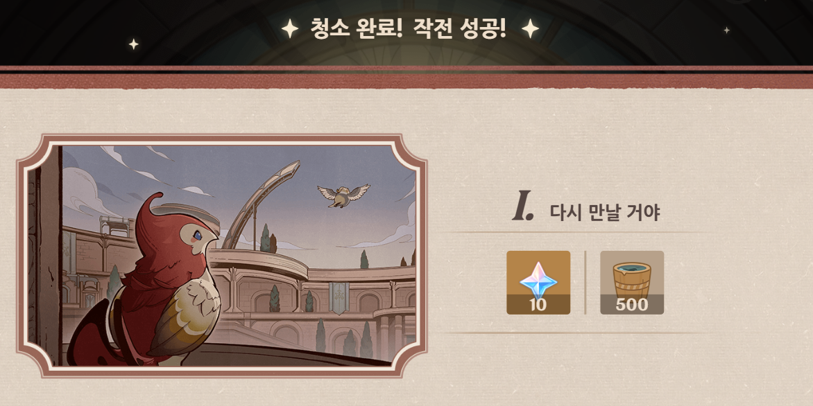 보상 목록 청소 의뢰 스테이지 보상 원석 x 85 영웅의 경험 x 4 정제용 마법 광물 x 4 청결 평판 달성 보상 원석 x 35 영웅의 경험 x 5 정제용 마법 광물 x 4 보상 지급 소환 완료 보상 원석 x 80 |
