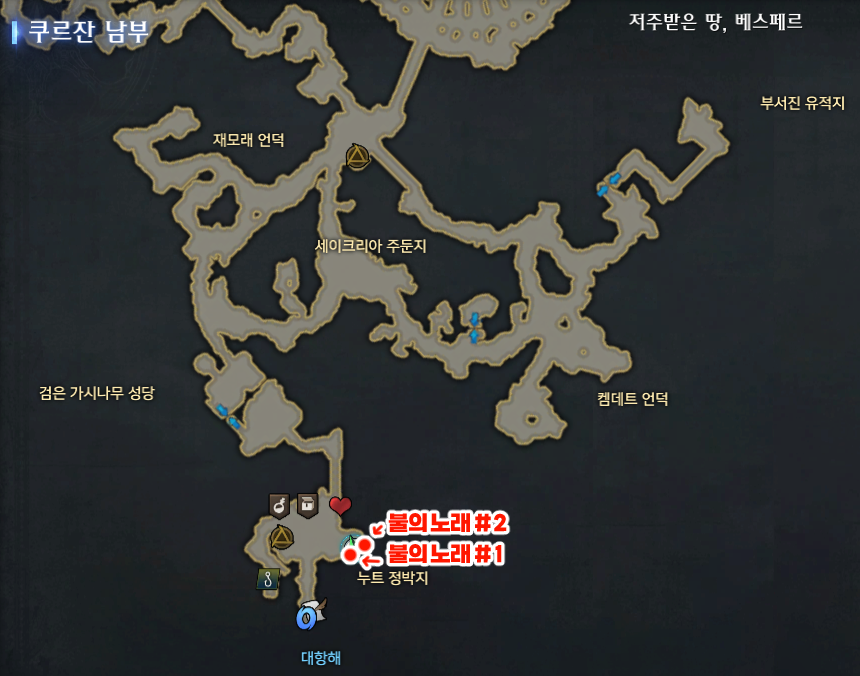 쿠르잔 남부 모험의 서 숨겨진 이야기 [ 쿠르잔 데런 지침 ] 스포없이 위치만 ~ 쿠르잔 남부 저주받은 땅, 베스페르 폐허가 된 유적지의 쿠르잔 데런 지침 위치 가는 길에 중간 중간 떨어진 종이