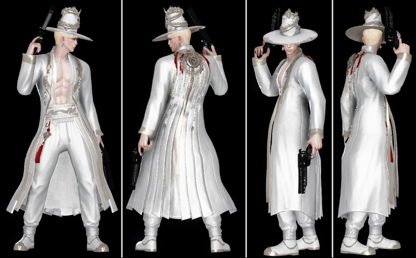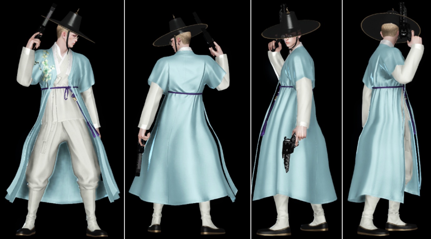 화려한 느낌의 광휘세트. 한복...? 인지는 잘 모르겠고 이것저것 동양풍적인 요소를 짜집기해 만든 의상인가 싶다. 정면에서 봤을 땐 몰랐는데 뒷태처리가 독특하게 되어있다. 화려하긴 한데 딱히 멋있나...? 는 좀 의문인 듯. 어둡게 덮어 디테일을 좀 감추고 무늬 파트를 돋보이게 하는 식으로 살릴 수는 있을 듯. 근데 요 근래 계속 바지는 다리 길어 보이게 잘 뽑은 거 같은데 왜 이 바지는 이렇게 똥싼바지처럼 만들었는지 모르겠다. 상의 부분이 좀 올라가서 더 그렇게 보이는 건가도 싶고.