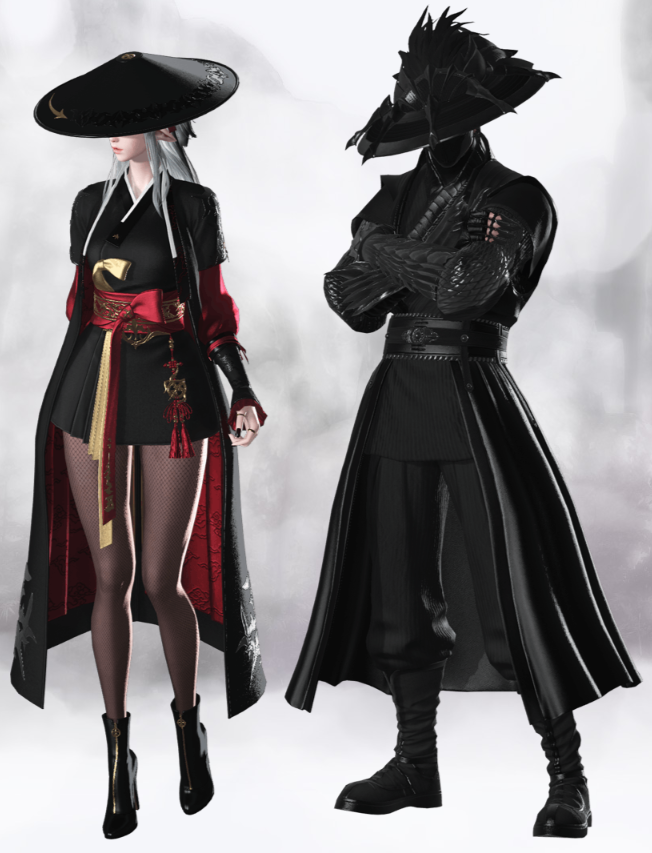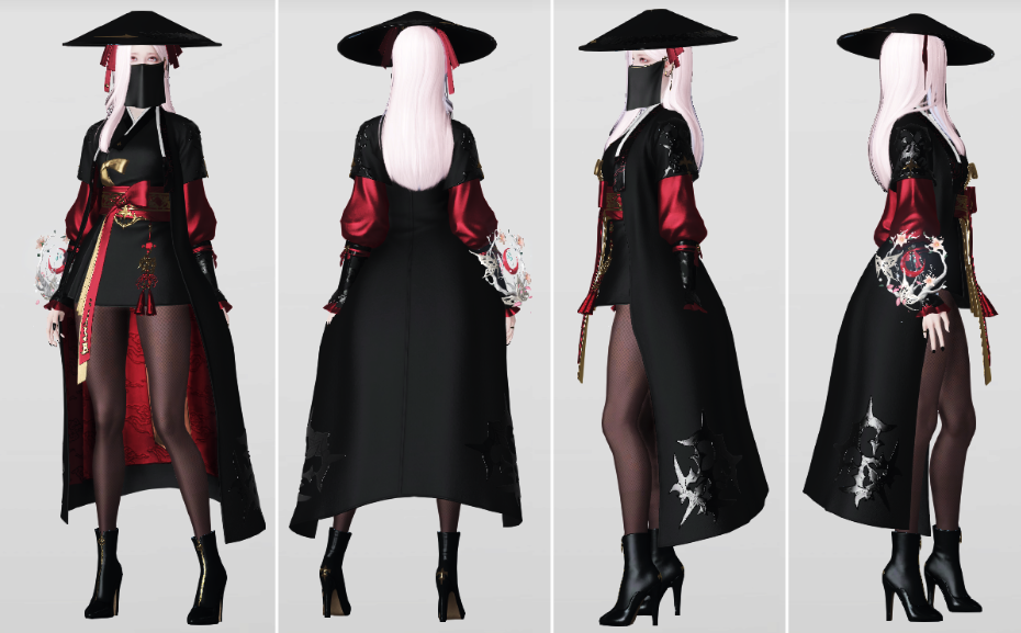 친구랑 맞추려고 먼저 샀던 야망세트. 모자 때문인가 묘하게 일본 닌자...? 느낌도 나는 것 같다. 화면에선 잘 티 나지 않지만 스타킹 부분이 망사고 염색불가 파트다. 난 광휘세트가 마음에 들었지만 제일 취향 덜 타면서 예쁘게 나온 디자인이 아닌가 싶음. 주변에서도 제일 먼저 많이 사는 것 같았고 가격도 야망이 다른 옷들에 비해 조금 높게 형성되어 있다. 코트같이 움직임 따라 팔락이는 상의도 좋고 상하의 밸런스나 장식 디테일도 좋음. 깃 부분이 고정 광택인 부분이 있어 밝은 색은 좀 탁해 보이는 단점이 있지만 짙게 염색하면 텍스처 차이가 나서 제법 고급스러워 보인다.