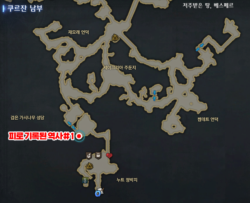 신규 대륙 쿠르잔 남부의 모험의 서 뷰포인트 모음 쿠르잔 남부의 뷰포인트는 총 5포인트 입니다 1. 저주받은 땅, 베스페르 뷰포인트 - 3포인트 베스페르 뷰포인트 전체 위치 디테일은 아래 스샷