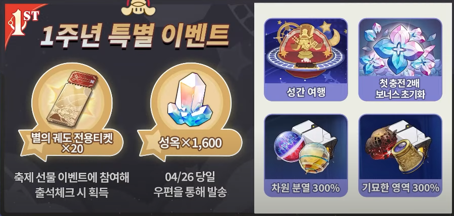 별의 궤도 전용 티켓 x 20 (출석 보상) 성옥 x 1,600 (04 / 26 우편 발송) = 총 30뽑 |