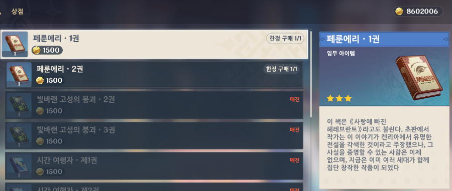 [ 시간 여행자 ] 전집 모으기따로 획득할 수 있는 업적은 없습니다 시간 여행자 는총 3권으로 구성되어 있습니다 1, 2, 3 권 위치폰타인에서 책을 판매하는 NPC폰타인 성 출판물 노점 주인휴벨이