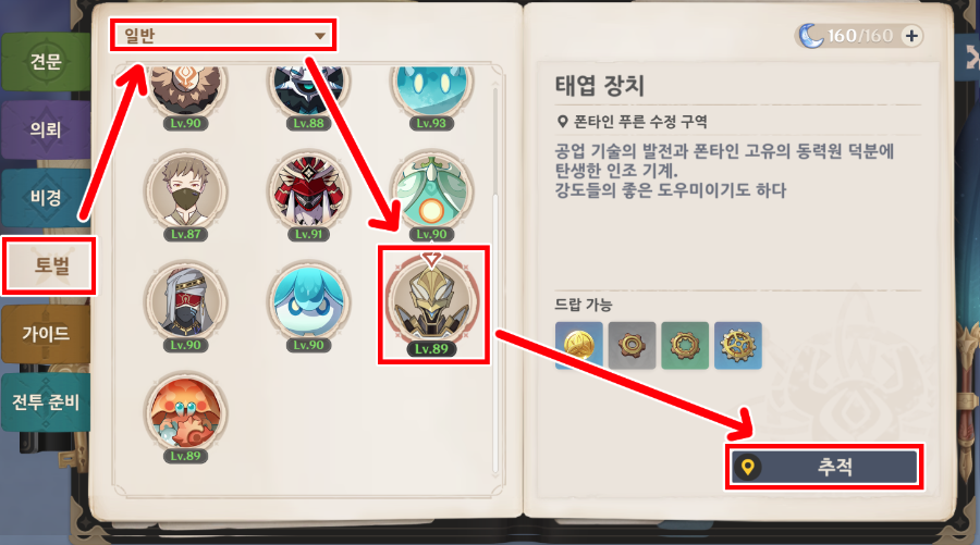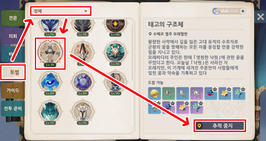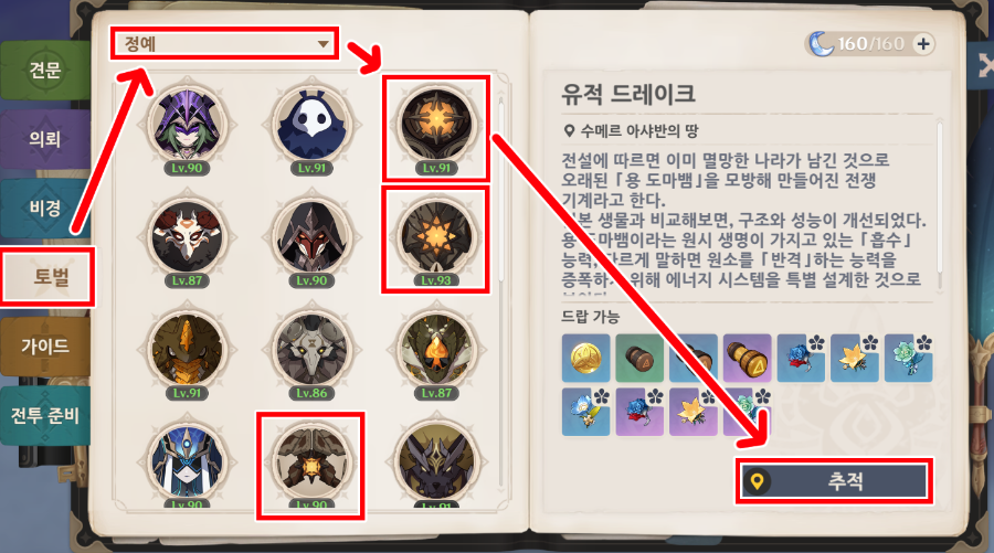 토벌 > 정예 > 유적 몬스터 선택 > 추적