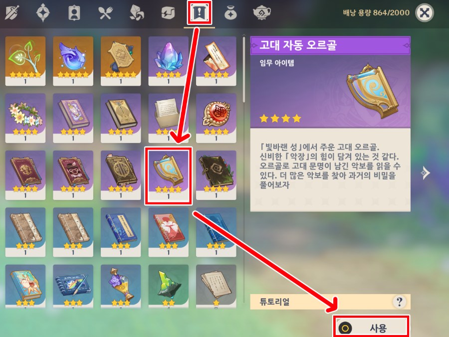 퀘스트 탭 > 고대 자동 오르골 > 사용