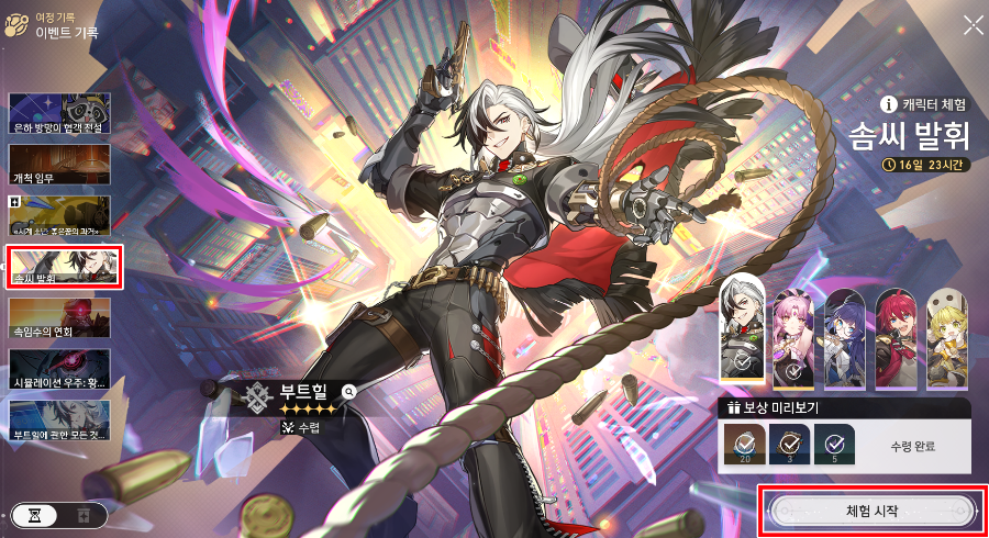부트힐 전택 후 체험 시작 클릭