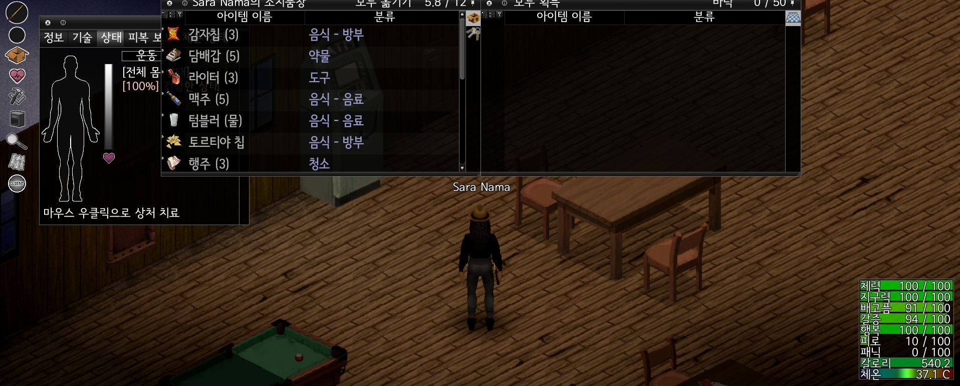 당구장에서 깨어났다. 처음 시작할땐 몰랐는데 무기랑 마실것, 먹을것이 같이 있어 운이 좋았다.