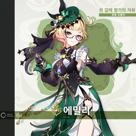 이름: 에밀리 호칭: 천 갈래 향의 자취 유명 조향사 신의 눈: 풀 운명의 자리: 향료병자리 |