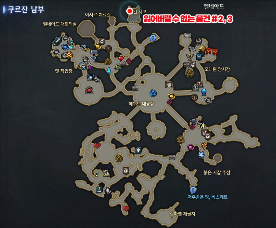 쿠르잔 남부 모험의 서 숨겨진 이야기 [ 우리 우정 영원히 ] 스포없이 위치만 ~ 쿠르잔 남부 엘네아드 지역 각각 12시방향 / 중앙에 하나씩 아래 스샷의 미니맵 위치 참고 우리 우정 영원히 # 1 우