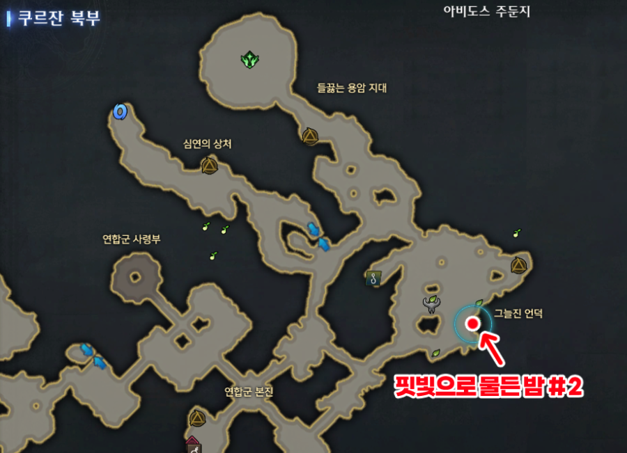 쿠르잔 북부 모험의 서숨겨진 이야기[ 떠나 온 이유 ] 스포없이 위치만 ~ 쿠르잔 북부 아비도스 주둔지연합군 본진에서 돌아 다녀야함몹은 없어서 찾기 나쁘지는 않은데3번위치가 영 애딴
