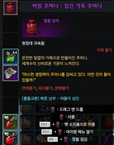 베른남부 칸다리아 지역의 채집물을 수색 스킬을 킨채로 뒤져서 칸다리아 토끼 찾아서 잡기 칸다리아 토끼가 확률로 떨구는 온전한 빛깔 가죽 10개를 모아 베른 남부 떠돌이 상인이 파는 비밀주머니 : 질긴 가죽 주머니로 교환하면 확정으로 얻을 수 있다. |