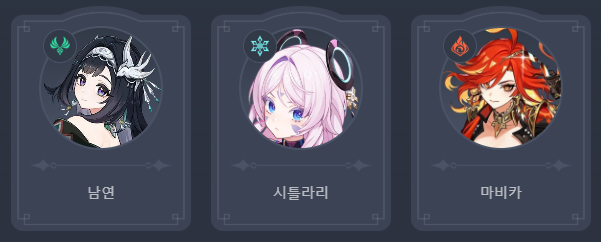 | 남연 | 슈브르즈 | 로자리아 | 디오나 | 베넷 |